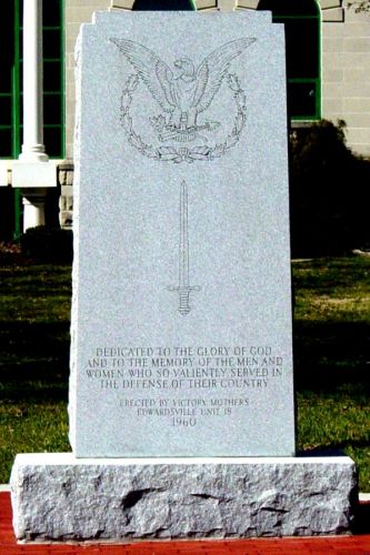 In 1958 the members raised a wooden cross in City Park while they raised funds for the construction of the grey granite monument. Those present for the cross dedication were: Alderman Henry (Bud)Kreuiter; Mrs. William Mayberry, VM Historian; Mrs. Louis Klenke, VM Chaplain; Mayor William Straube; Mrs. Edward Koenig, Chairman of the VM Memorial Committee; Mrs. J. W. Augsberger, VM Unit 18 Vice-president; Mrs. L.L. Kneier, VM Past President; A.H. Pauli, Edwardsville Chamber of Commerce Secretary; and Kenneth Wohlford, Chamber President. Two years later, in 1960, the Victory Mothers of Edwardsville Unit #18 along with other guests dedicated the monument.